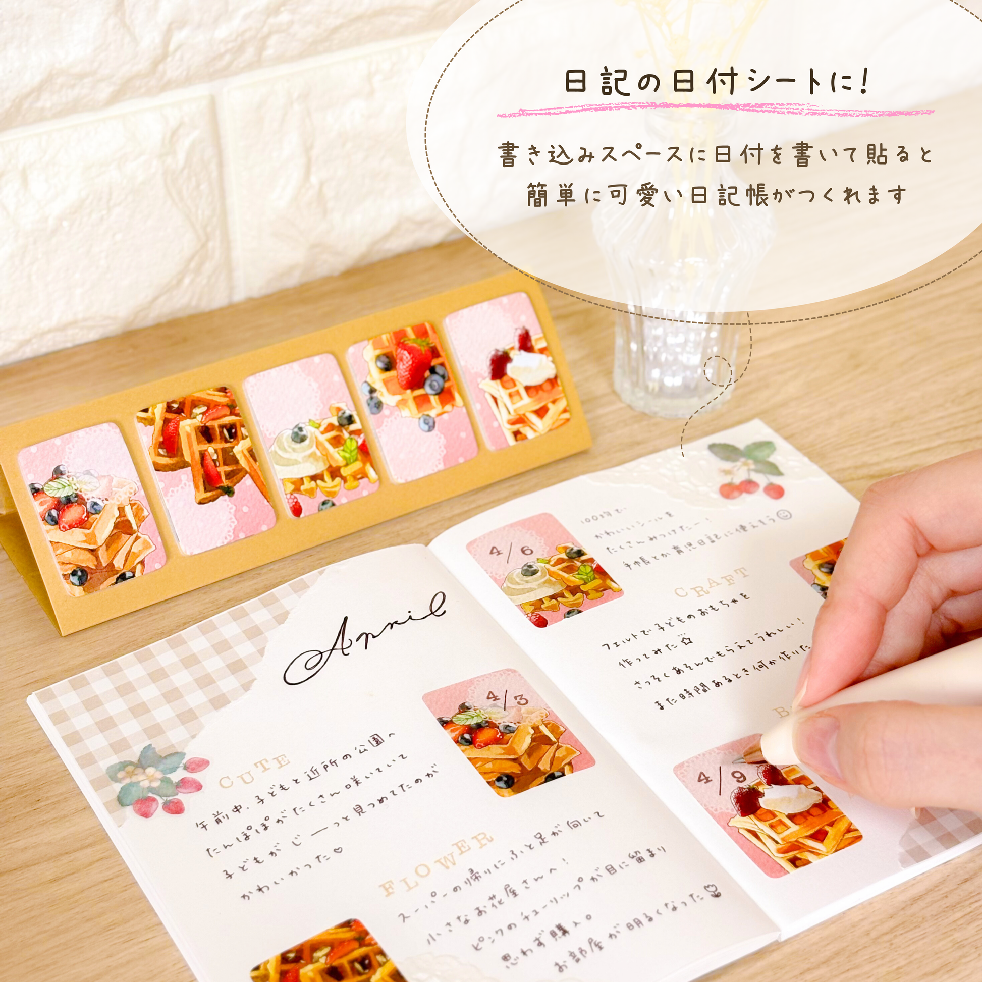 書き込みスペースに日付を書いて貼るだけで簡単に可愛い日記帳が作れます。